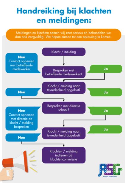 Een klacht moet schriftelijk worden ingediend. Dat kunt u doen per e-mail naar klachten@asg.nl of per post: Almeerse Scholen Groep, t.a.v. College van Bestuur, postbus 60276, 1320 AH Almere.